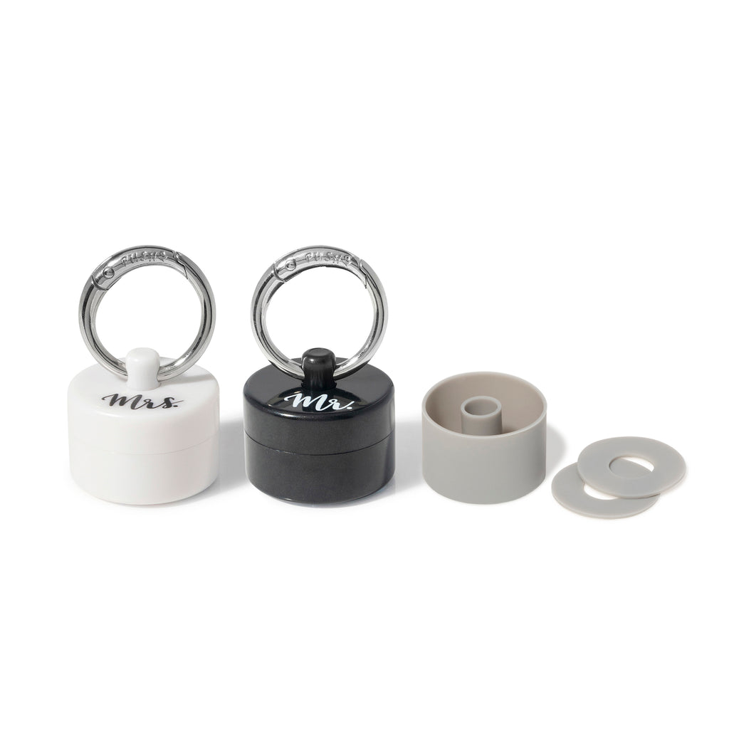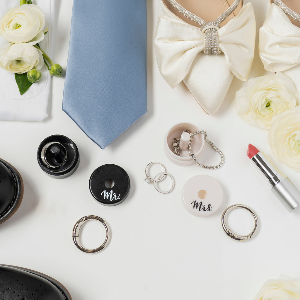 Set includes 1 "Mr", 1 "Mrs" & 1 silicone insert -- No lost jewelry and No stress.