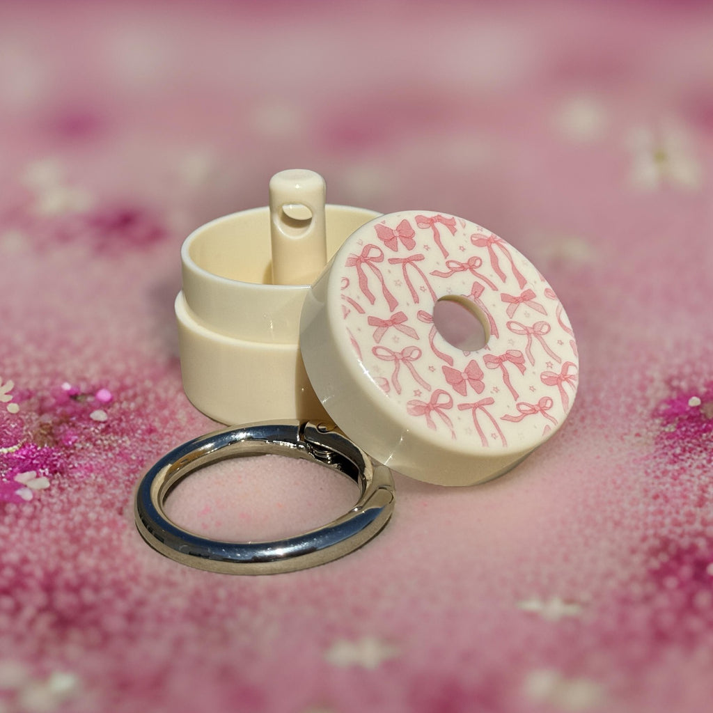 Pink bows printed on vanilla — no lost jewelry and no stress.