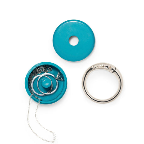 Protect your small jewelry on the go with a turquoise Lion Latch! Our patent protected product contains a custom carabiner ring that has to be fully removed before you can pull the lid completely off.